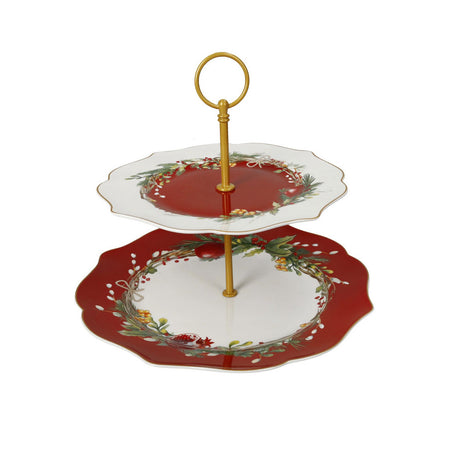 BRANDANI Carol Alzata 2 Piani con Asta Oro 26x23cm Porcellana Tavola di Natale