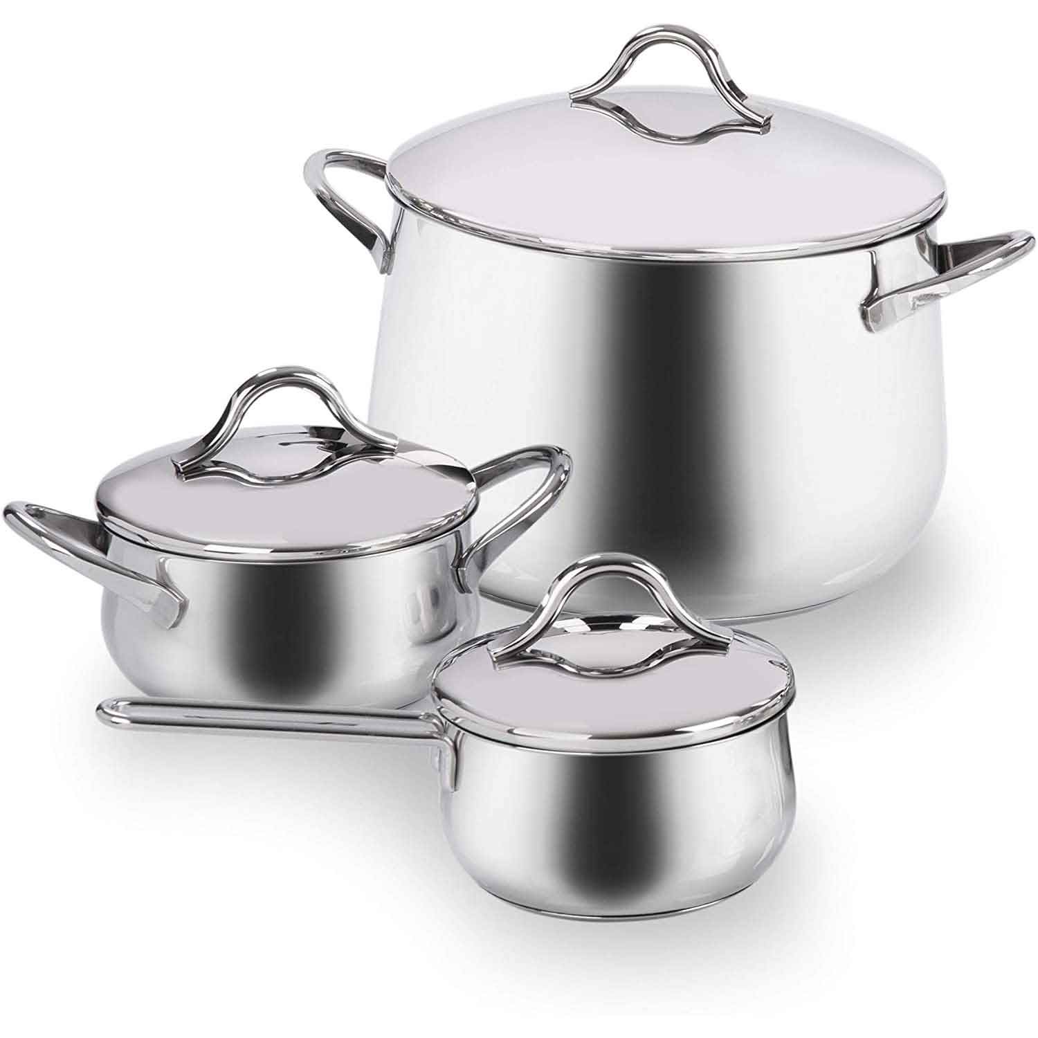 A very versatile and complete set made up of 24 pieces made of 18/10 stainless steel. This set is designed to provide all the tools you need for both cooking and serving. For this reason, in addition to the pots and pans, it includes the following accessories: ladle, skimmer, spatula, spaghetti server, fork, spoon and potato masher. Characterized by a rounded shape, the pans that make up the set are characterized by the high quality of the materials and the high cooking performance and durability that they are able to offer.