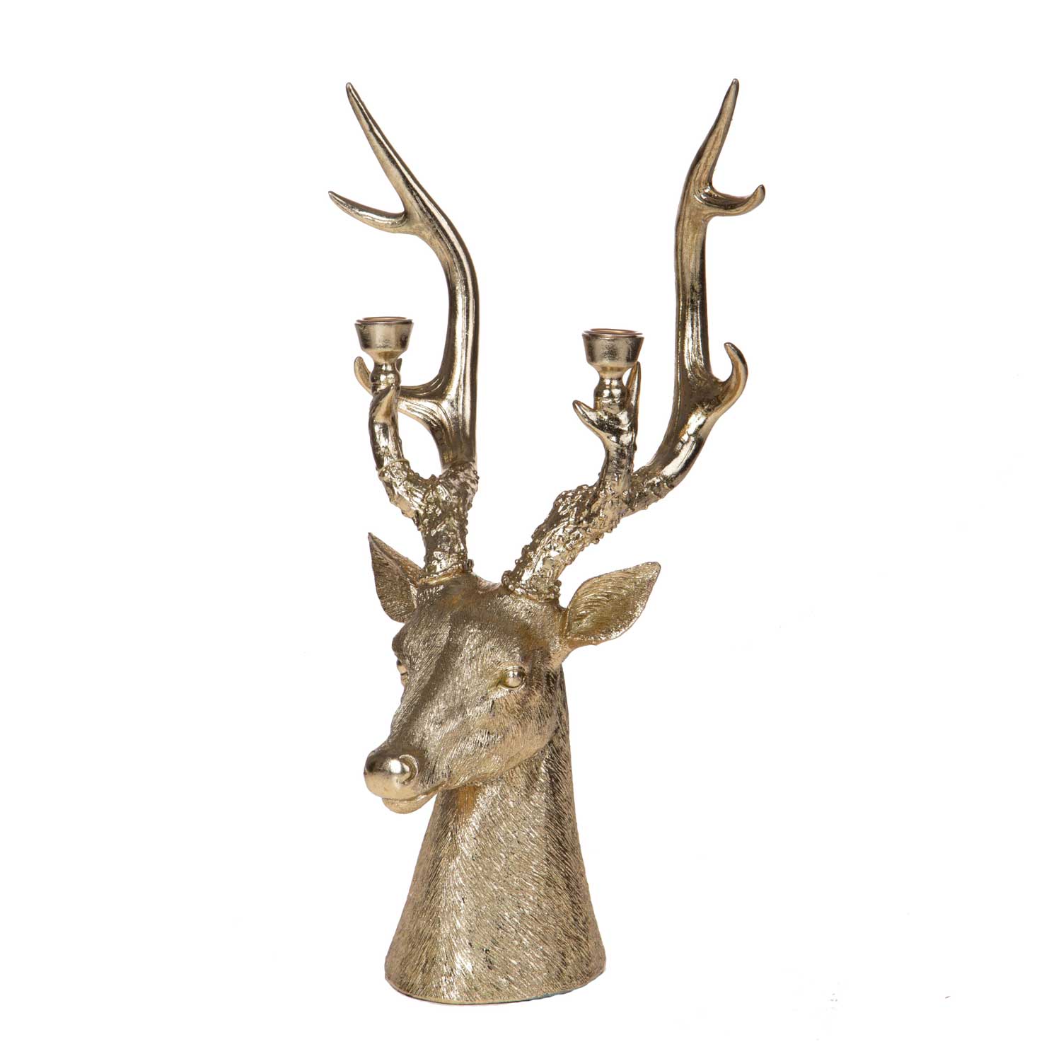 Candeliere natalizio a forma di renna color oro di Bianchi Dino, realizzato in poliresina di qualità e alto 44,5 cm. Con la sua finitura dorata luminosa e la cura dei dettagli, è un elemento decorativo elegante e scenografico, perfetto per impreziosire la tavola, il camino o un angolo dedicato alle feste.
