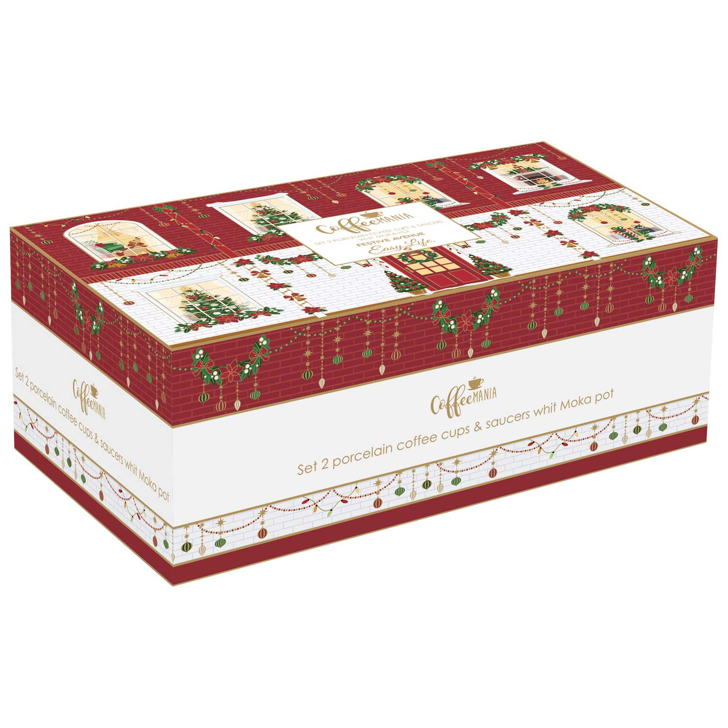 EASY LIFE Festive Avenue Set 2 Tazzine Caffè Espresso con Piattino e Caffettiera Porcellana