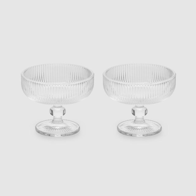 Rendi ogni momento speciale con questo elegante set di due coppette firmato Enzo De Gasperi. Realizzate in vetro finemente lavorato a righe, queste coppette con piede raffinato uniscono stile e funzionalità, perfette per servire con eleganza gelato, frutta, dessert e dolci al cucchiaio.
