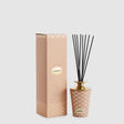 Il diffusore a bastoncini Enigma di Enzo De Gasperi in vetro rosa con decoro dorato unisce estetica romantica e profumeria d’autore per trasformare ogni ambiente in un’oasi di benessere.