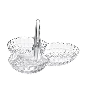 Original appetizer that can be sold both as a single piece and in two modular pieces: anchored to a vertical support we find three bowls sized to contain chips, pistachios, peanuts and small snacks and, thanks to an interlocking mechanism it is possible to place another appetizer on top of the first creating a new six-bowl one.