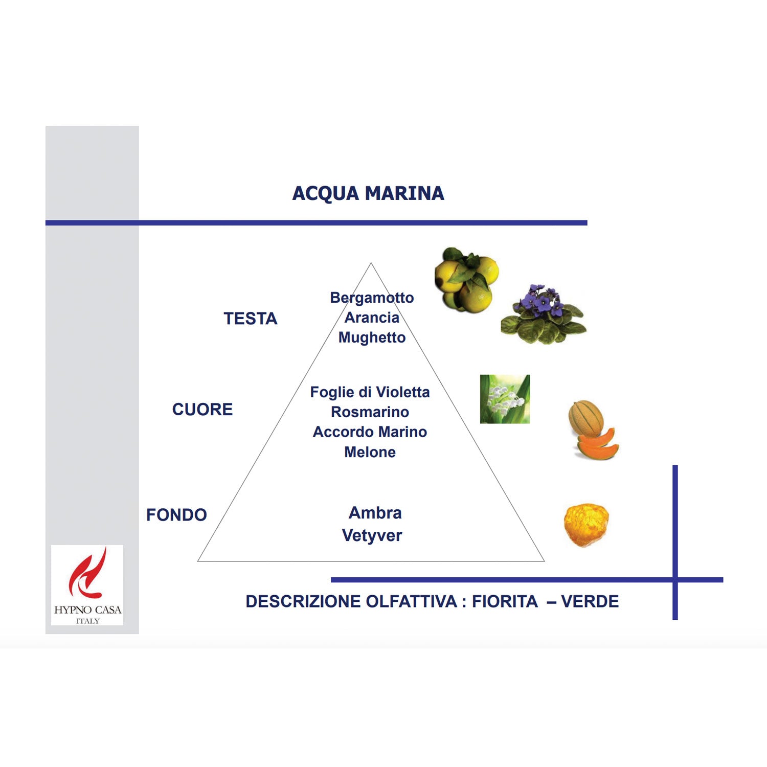 Acqua Marina: a relaxing, bright and sunny fragrance thanks to the combination of orange, bergamot and lily of the valley. In the heart, rosemary blends with an intense marine accord, which reveals fruity facets. On the base, a light touch of vetyver combines with the sensual notes of amber.