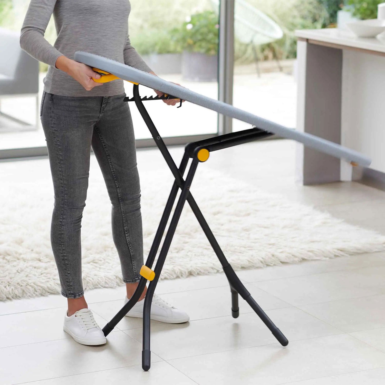 This revolutionary full-sized ironing board features a unique stand design that makes it more compact when stored than other conventional ironing boards.