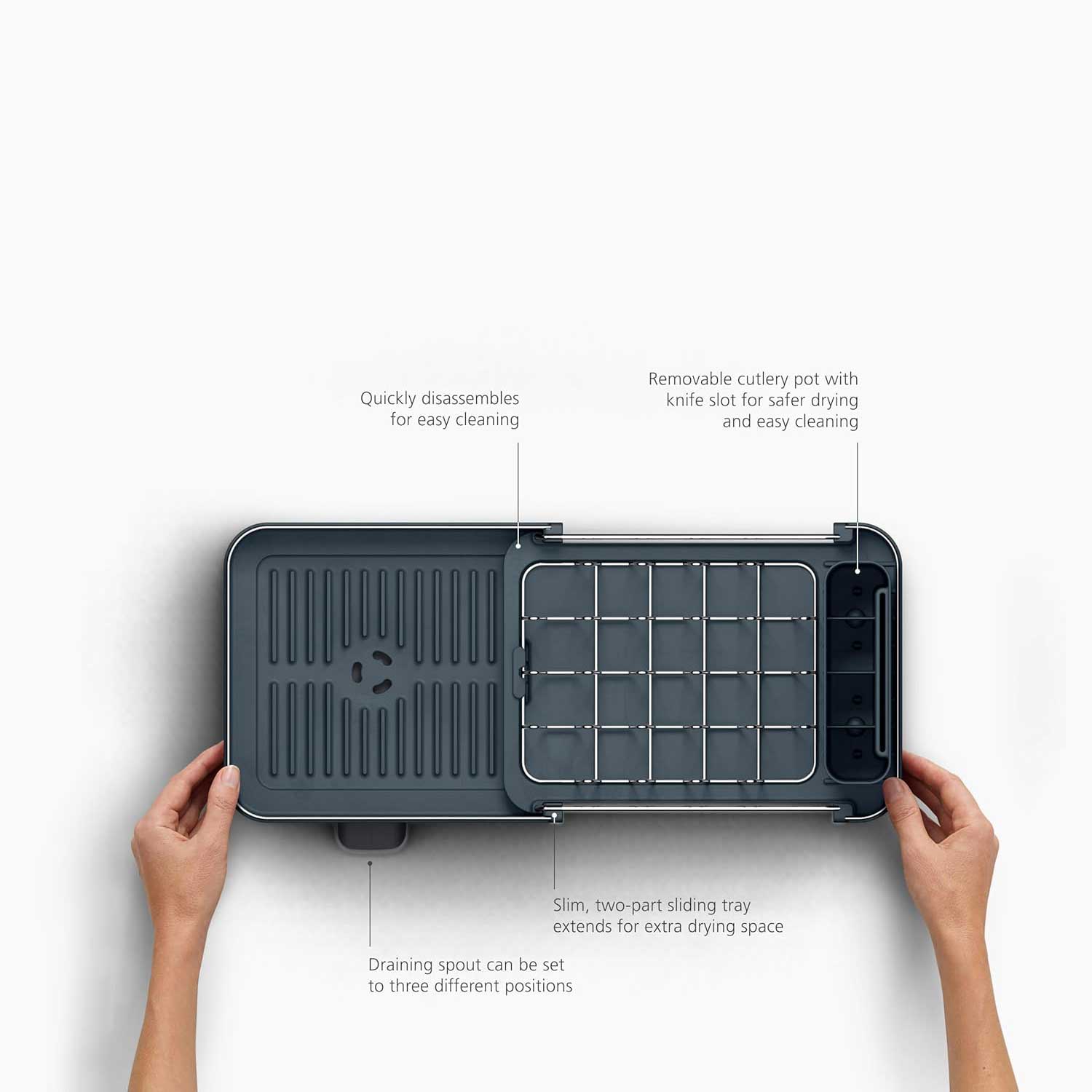 Incluso nel set c'è anche un portaposate rimovibile con slot per coltelli, che semplifica l'asciugatura sicura delle posate e dei coltelli più affilati. L'intera unità si smonta facilmente per una pulizia rapida e intuitiva, rendendola perfetta per l'uso quotidiano.