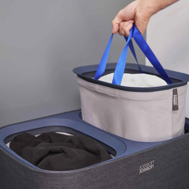 Introducing Tota, the intelligent and elegant laundry basket. Designed with double compartments and removable, easy-to-carry bags, Tota reduces the time and energy needed to separate clothes and carry heavy loads to the washing machine. It also looks good in the bedroom, bathroom or utility room.
