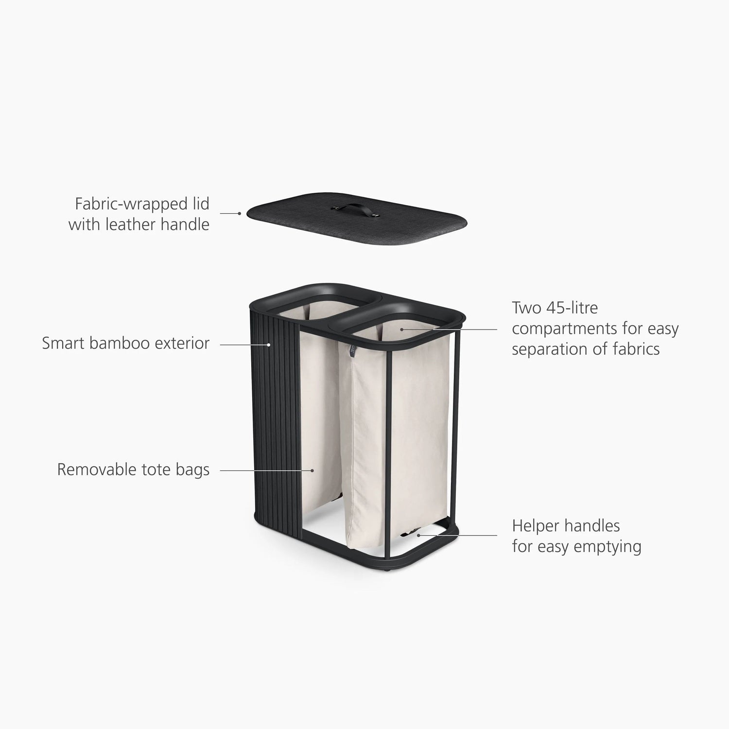 Realizzato con una struttura in bambù naturale, sacche interne rimovibili e un elegante coperchio imbottito rivestito in tessuto, è l’accessorio ideale per separare facilmente i capi chiari da quelli scuri grazie ai suoi due scomparti da 45litri.