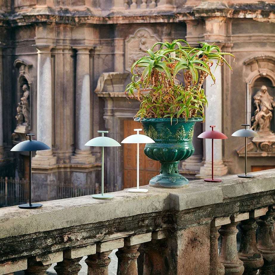 MINI GEEN-A - in white, black, green, burgundy and bronze - reinvents the reading lamp with the battery-operated and corded table version and maintains clean lines and increases its portability and opportunities for use. Can also be used outdoors.
