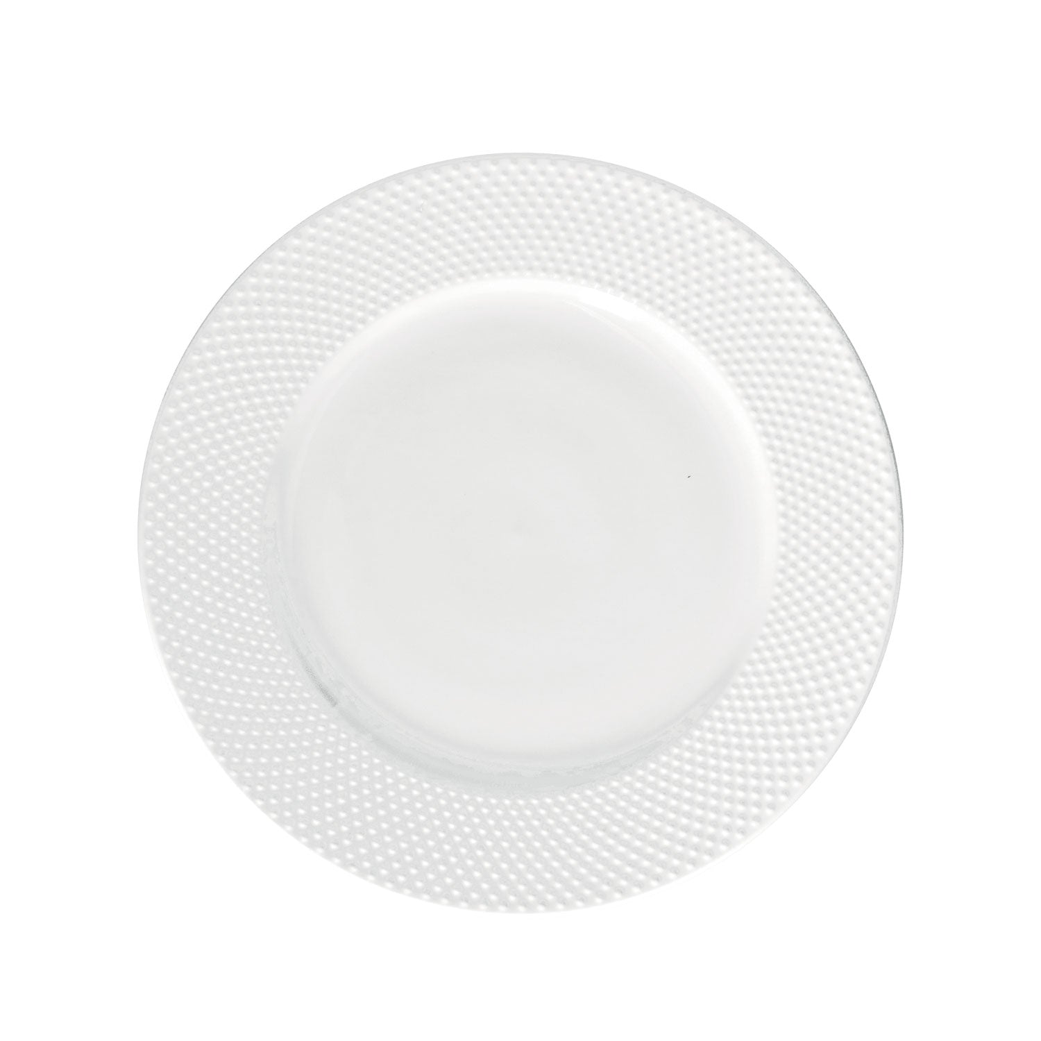 The passepartout color par excellence - white - combines with a very delicate relief decoration. A dotted motif that adorns each product in the collection with indescribable grace. For a table capable of recalling beauty in every season. Set consisting of 6 plates.