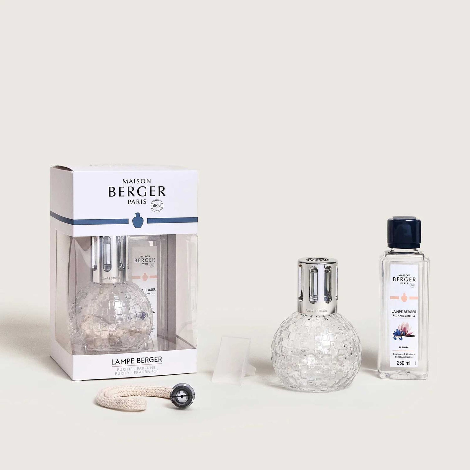 Il cofanetto regalo Lampe Berger Disco si distingue per la sua iconica forma rotonda e il suo design ispirato alla scacchiera, realizzato in vetro sia incassato che rialzato.