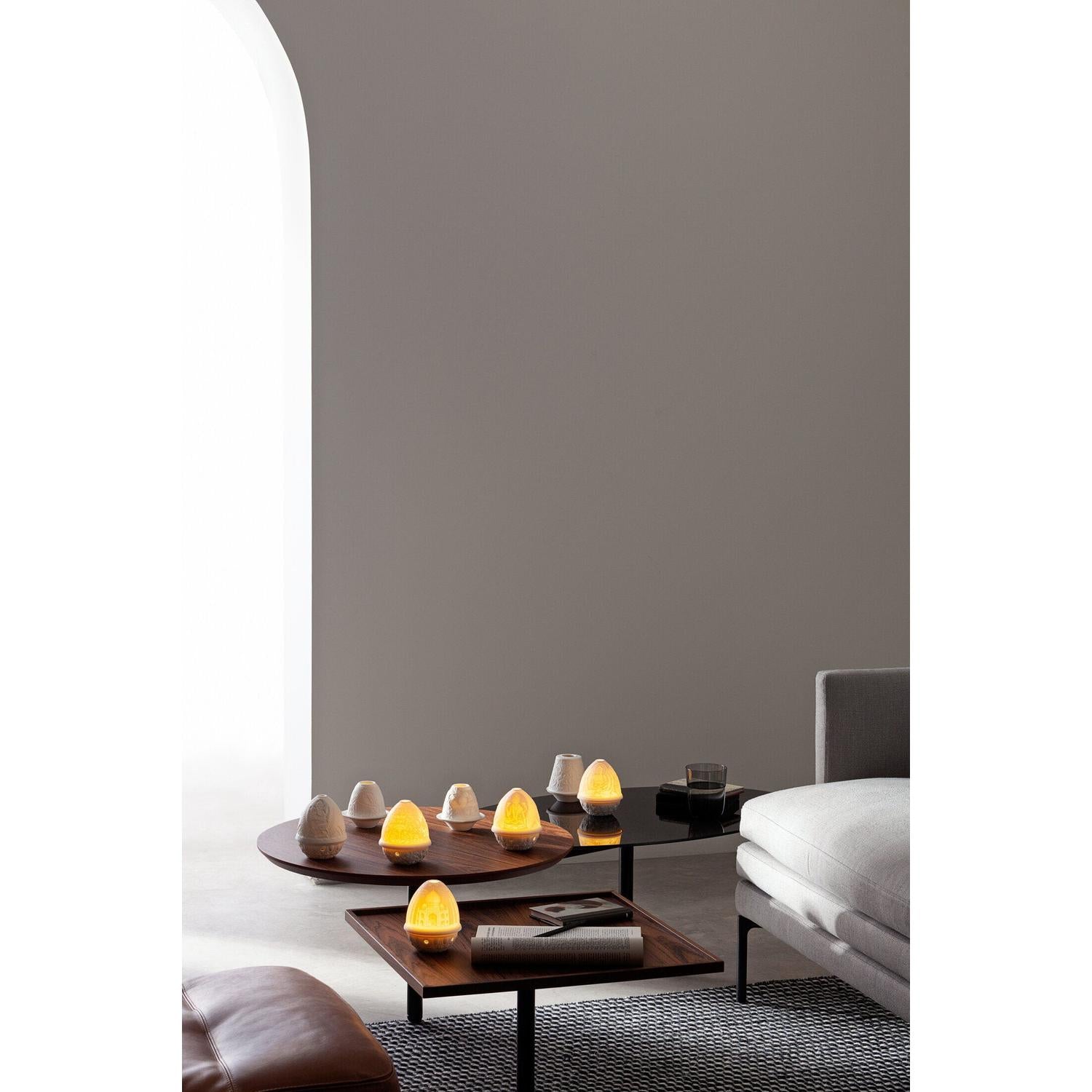 La litofania è disponibile in due versioni: il modello 01017378 include un LED elettrico, mentre il 01017382 è dotato di un modulo LED ricaricabile. Il modulo LED è integrato nella litofania e può essere fissato alla base tramite un adesivo incluso. È presente un interruttore tattile per regolare l'intensità della luce, permettendo di personalizzare l'atmosfera in base alle proprie preferenze.