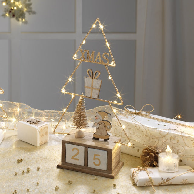 Scopri la magia del Natale con il calendario dell'avvento di Mascagni Casa, un'incantevole decorazione che unisce tradizione e design moderno. L'abete stilizzato in metallo, illuminato da luci LED, crea un'atmosfera scintillante e festiva, mentre alla base si trova un Babbo Natale in legno, delicatamente colorato in oro.