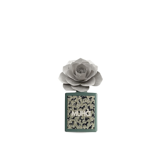 Home air freshener in a refined painted glass bottle with jacquard woven label and handmade flower-shaped diffuser in natural birch wood.