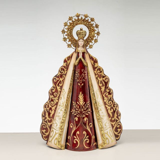 La Madonna indossa un abito ricamato nei toni del rosso, oro e bianco, che le conferisce un aspetto nobile e festoso, perfetto per le celebrazioni natalizie.