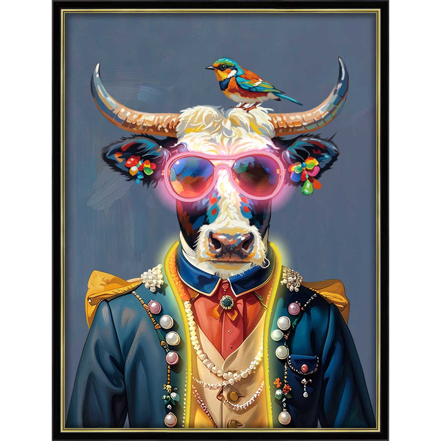 Il quadro a LED con cornice di Palais Royal raffigurante una mucca con occhiali da sole e un uccellino colorato sul capo è un concentrato di ironia e stile pop contemporaneo. Realizzato su tela con dettagli dipinti a mano, colpisce per i colori vivaci e l'originalità del soggetto, mentre la luce LED integrata illumina la scena esaltando le sfumature e i contrasti.