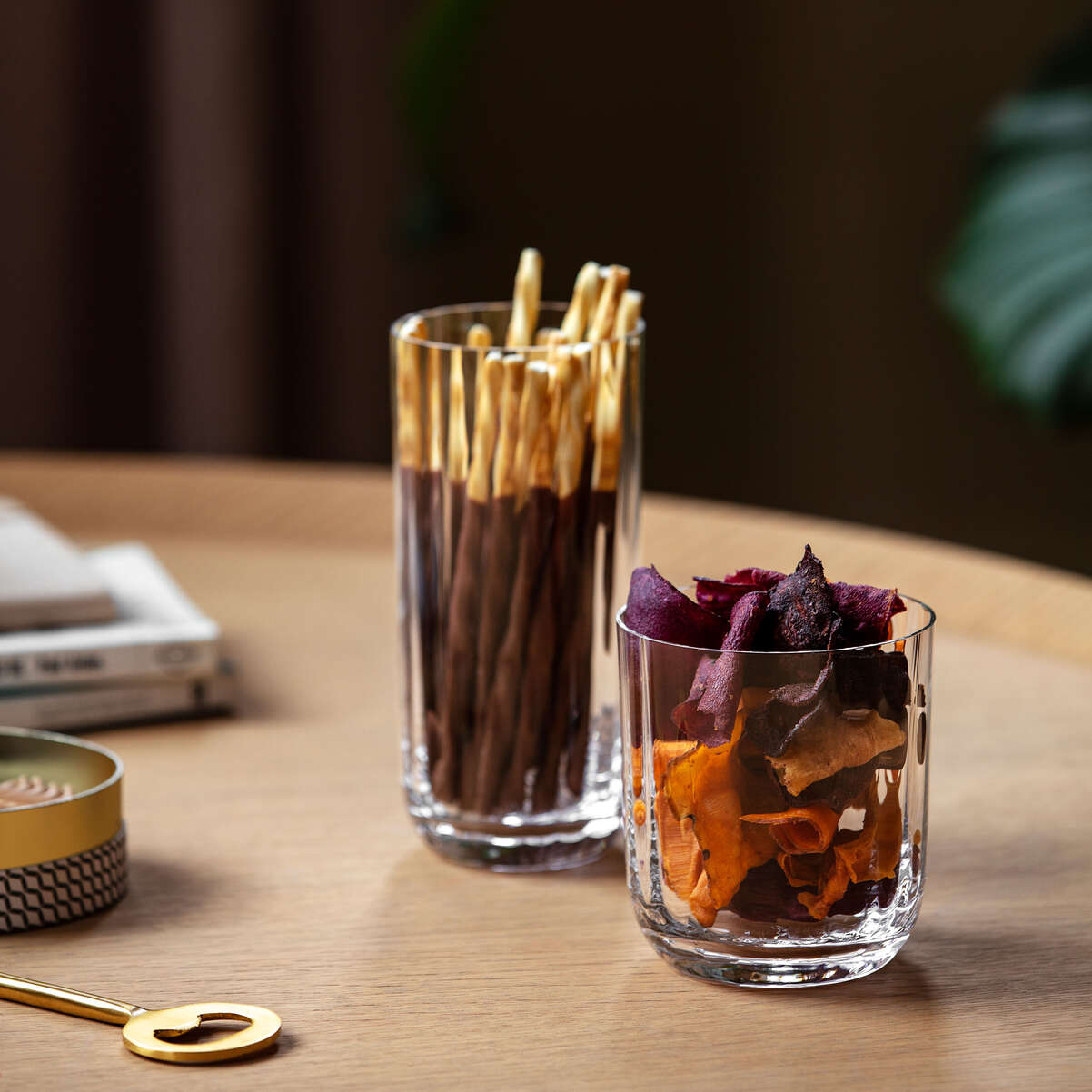 Il cristallo ad alta trasparenza garantisce brillantezza e resa cromatica straordinarie, mentre il profilo classico e leggermente cilindrico assicura una presa stabile e confortevole.