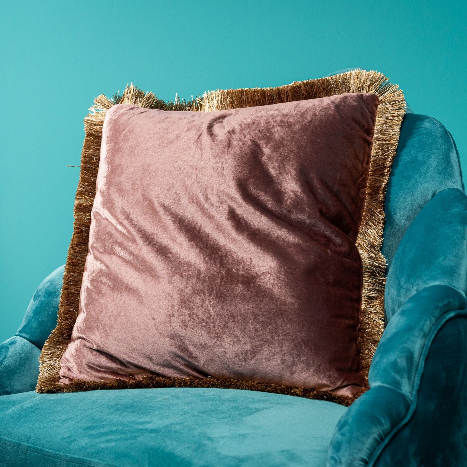Antique pink velvet-type polyester cushion with gold-colored fringes 45 x 45 cm.
