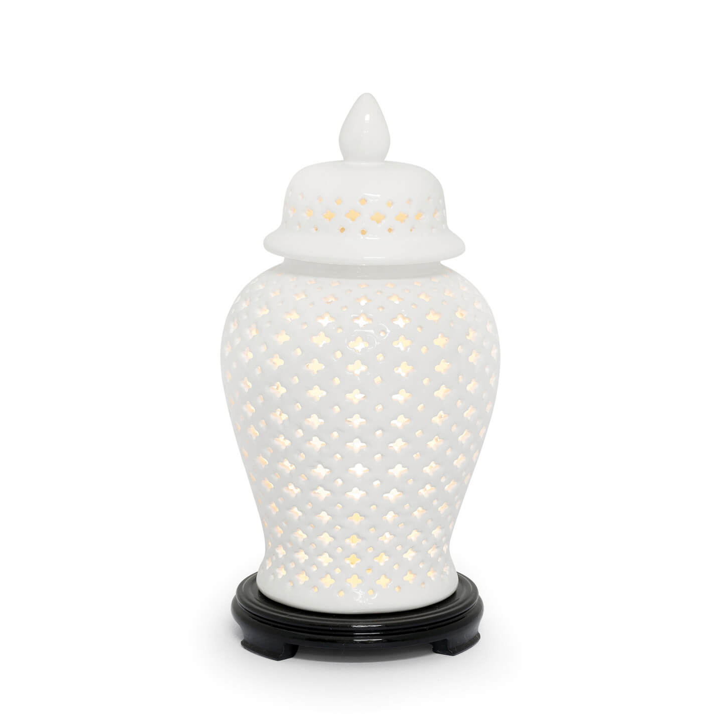 Le lampade, intagliate a mano con motivi geometrici orientali, creano suggestivi giochi di luce e ombra, donando atmosfera e carattere agli ambienti. La base in legno laccato nero le rende perfette per arricchire ogni spazio con un tocco di stile sofisticato e internazionale.