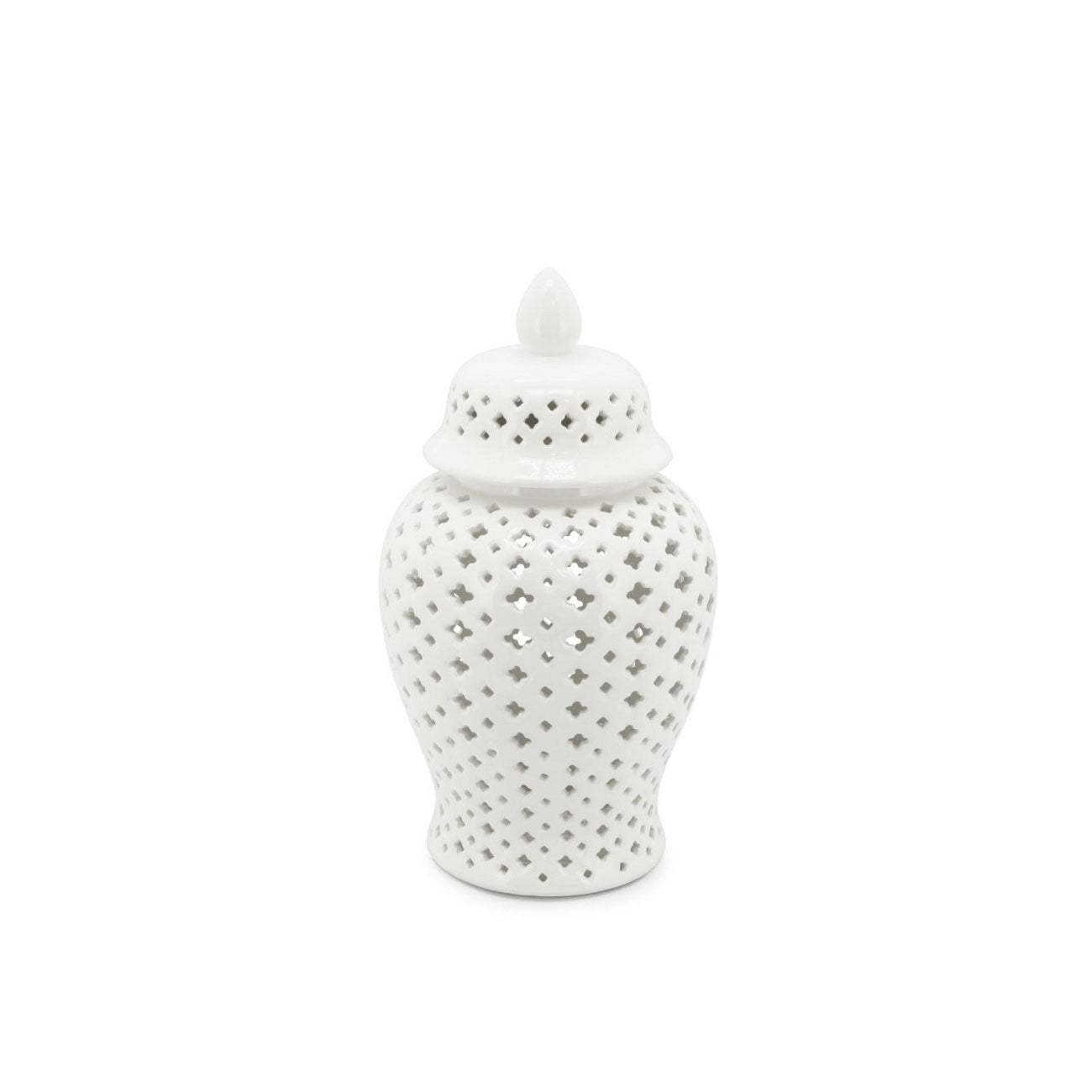 Il vaso Ming Cross è realizzato in ceramica di alta qualità e interamente traforato a mano, con un elegante motivo geometrico che ne esalta la forma raffinata ispirata alle tradizionali potiche orientali. La sua superficie, lavorata con maestria, riflette la luce in modo delicato, creando affascinanti giochi di luce e ombra che aggiungono profondità e personalità all’ambiente.