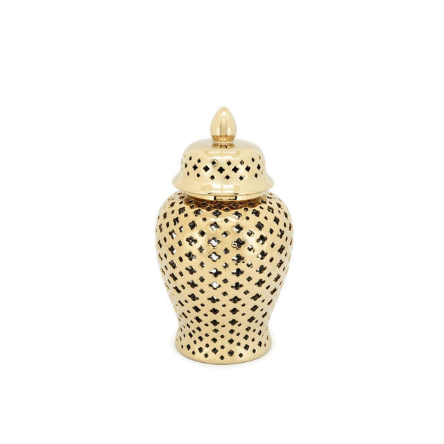 VASO A FORMA DI POTICHE CON STRUTTURA IN CERAMICA INTAGLIATA A MANO COLOR ORO.