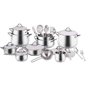 Una batteria molto versatile e completa composta da 24 pezzi realizzati in acciaio inox 18/10. Questo set è pensato per fornire tutti gli strumenti necessari sia per cucinare che per servire. Per questo motivo, oltre alle pentole e casseruole, include i seguenti accessori: mestolo, schiumarola, paletta, servispaghetti, forchettone, cucchiaione e schiacciapatate. Caratterizzate dalla forma bombata, le pentole che compongono la batteria si contraddistinguono per lalta qualità dei materiali e per le elevate prestazioni di cottura e durata che sono in grado di offrire.