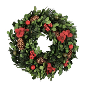 Materiale: foglie di bosso, pigne, fiori in poliestere e bacche in polistirolo.