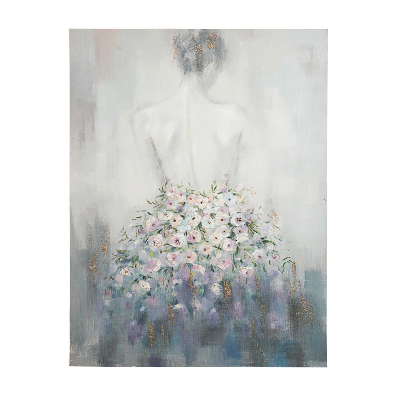 Questo dipinto Bizzotto misura 120×90 cm e raffigura una figura femminile di spalle, la cui silhouette è avvolta in un elegante abito composto da un ricamo di fiori cangianti, ricchi di texture e sfumature luminose.