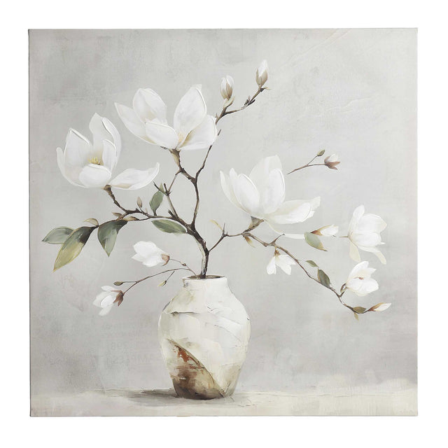Il quadro Bizzotto da 80×80 cm raffigura un elegante vaso colmo di magnolie, reso con la precisione della stampa su tela e impreziosito da finiture dipinte a mano che aggiungono rilievo e profondità ai dettagli.