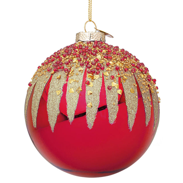 Illumina il tuo albero di Natale con la sfera Firework di Bizzotto, un'elegante decorazione in vetro rosso impreziosita da brillanti dettagli in glitter oro. Questo ornamento cattura lo spirito festivo, creando un affascinante contrasto tra il profondo rosso e il luccichio dorato.