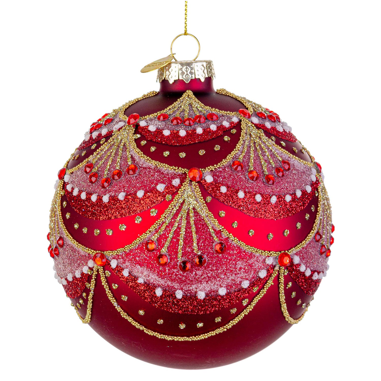 Decora il tuo albero con un tocco di eleganza senza tempo grazie alla splendida pallina natalizia in vetro di Bizzotto, di un intenso rosso acceso, impreziosita da delicate decorazioni in glitter oro e bianco. Questa raffinata pallina cattura la luce in modo incantevole, donando brillantezza e calore al tuo albero di Natale.
