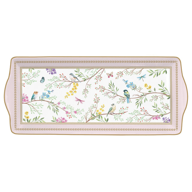 Con il suo design raffinato, decorato con uccellini che cinguettano tra delicati fiori e tonalità morbide, questo vassoio in porcellana è ideale per servire con stile antipasti, dolci o bevande.