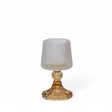 Un tocco di magia vintage in chiave contemporanea: il portacandele a forma di lampada con piede firmato Enzo De Gasperi è un vero gioiello decorativo. Realizzato in vetro lavorato con finitura lucida, richiama la silhouette iconica di una lampada da tavolo, con calotta superiore a cupola e base dal design elegante.