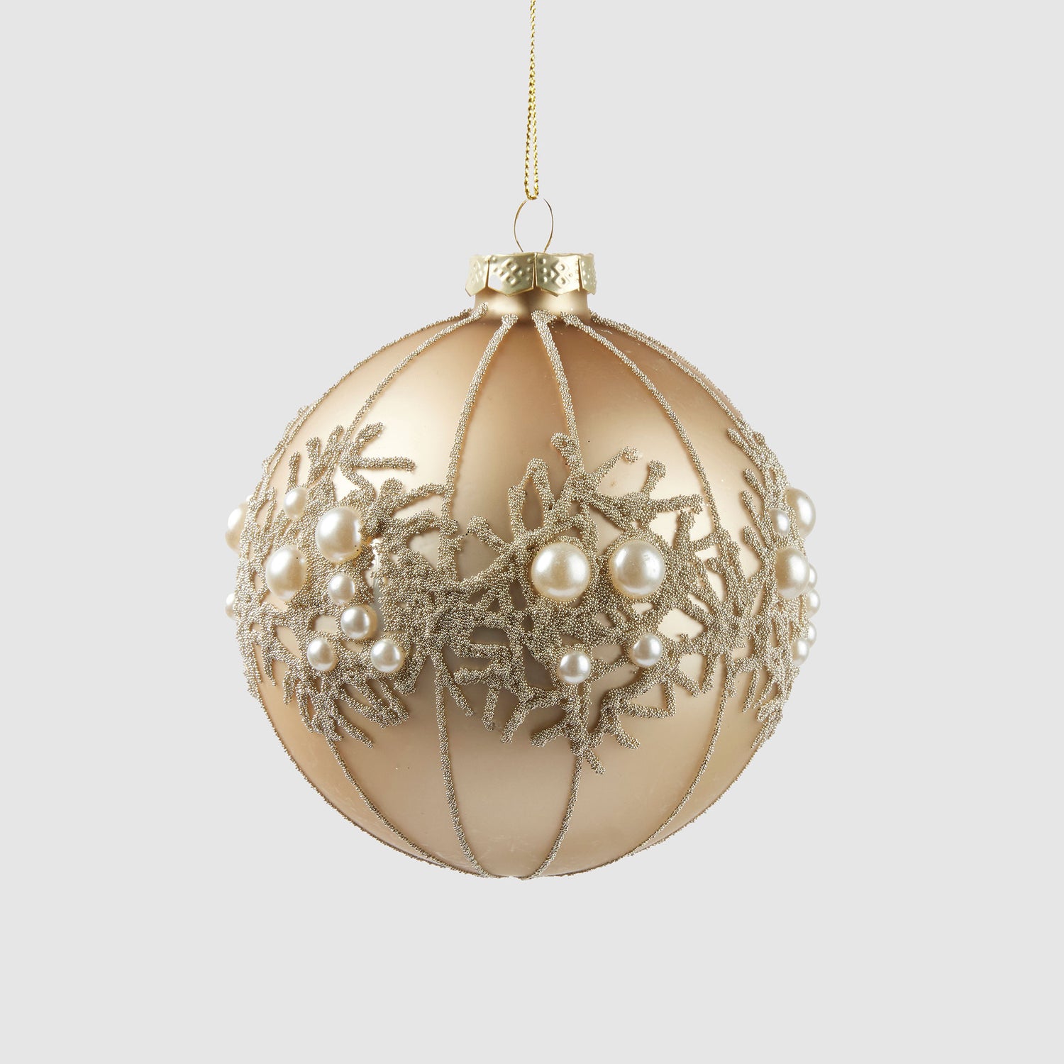 Aggiungi un tocco di eleganza senza tempo al tuo albero di Natale con la pallina in vetro color champagne di Enzo De Gasperi, impreziosita da delicate perle. Questo ornamento raffinato cattura la luce con grazia, creando riflessi sofisticati che esaltano la bellezza del vetro e delle decorazioni perlate.