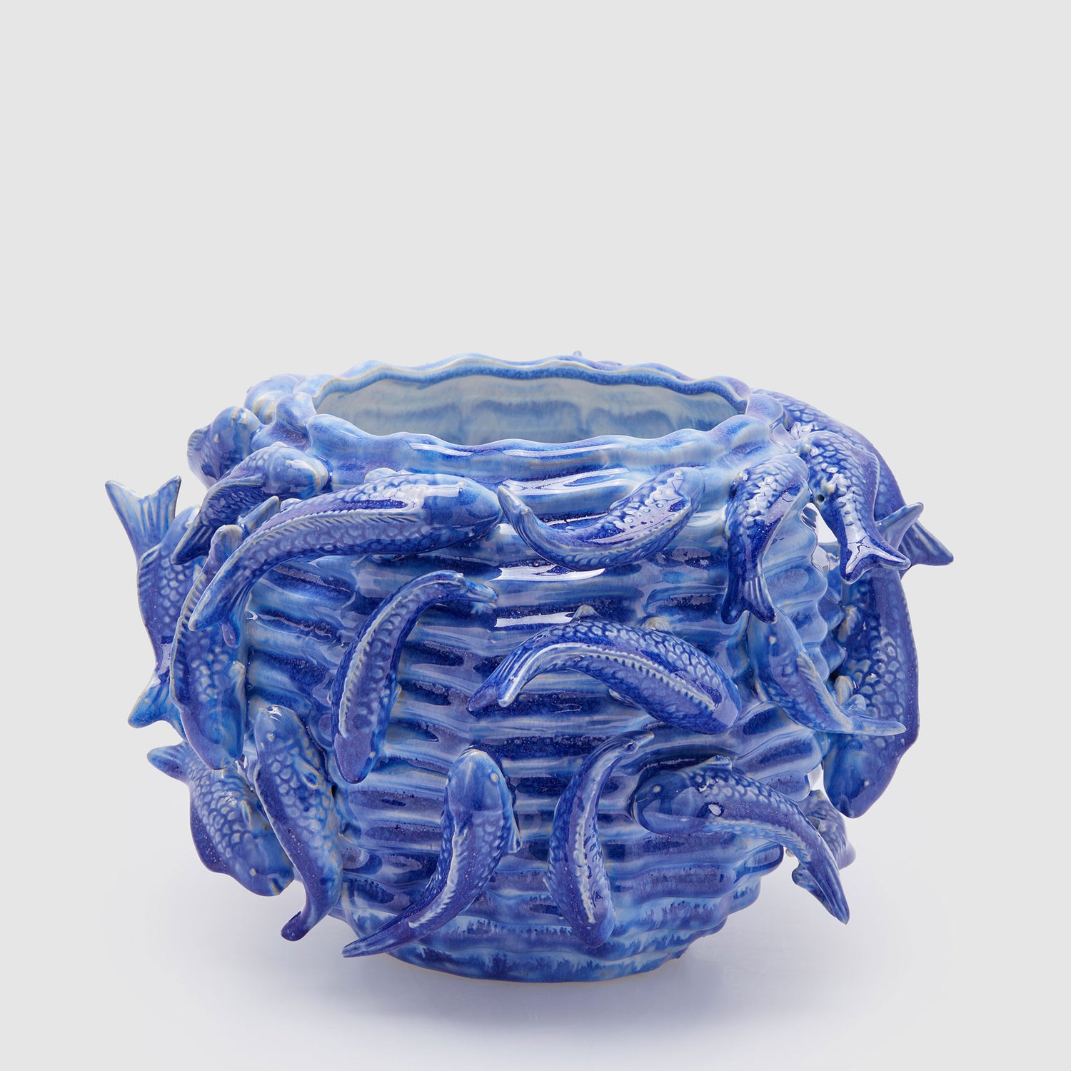 Il vaso Chakra di Enzo De Gasperi è una fusione di eleganza e simbolismo. Con il suo intenso blu ceramico e le raffinate carpe koi in rilievo, rappresenta prosperità e armonia, ispirandosi all’estetica orientale.