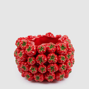 Il Vaso Chakra Pomodoro di Enzo De Gasperi è un'esplosione di colore e carattere che celebra la bellezza della natura con un design originale e affascinante. Realizzato in ceramica rossa lucida, questo vaso dal forte impatto visivo si distingue per la sua decorazione in rilievo: una corona di pomodori tridimensionali che avvolge la superficie, donandogli un aspetto vivace e unico.