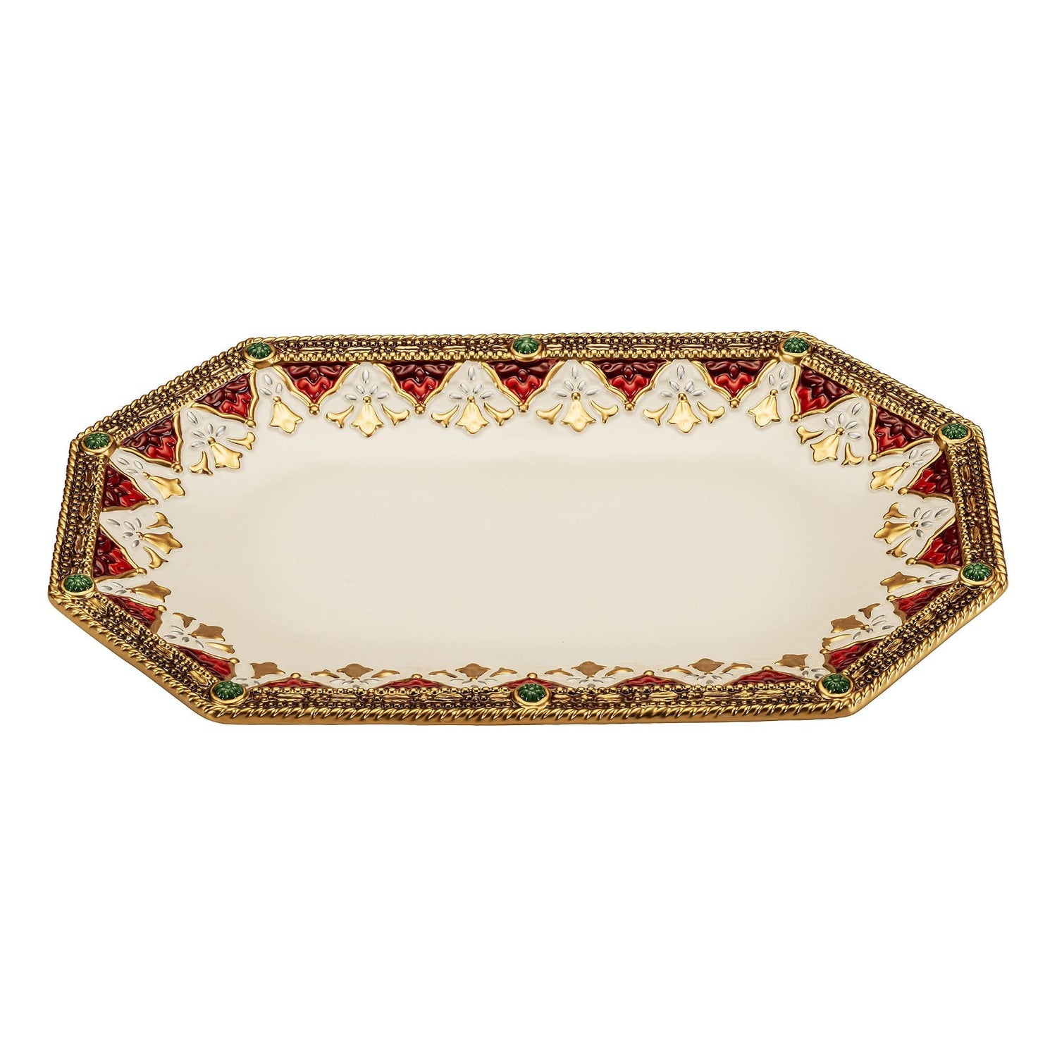 Rendi le tue festività indimenticabili con il Vassoio Natalizio di Fitz & Floyd! Questo elegante vassoio in porcellana, con dimensioni di 35x22 cm, presenta un interno bianco luminoso e un bordo decorato con raffinati motivi oro e rosso, perfetti per catturare l'essenza del Natale.