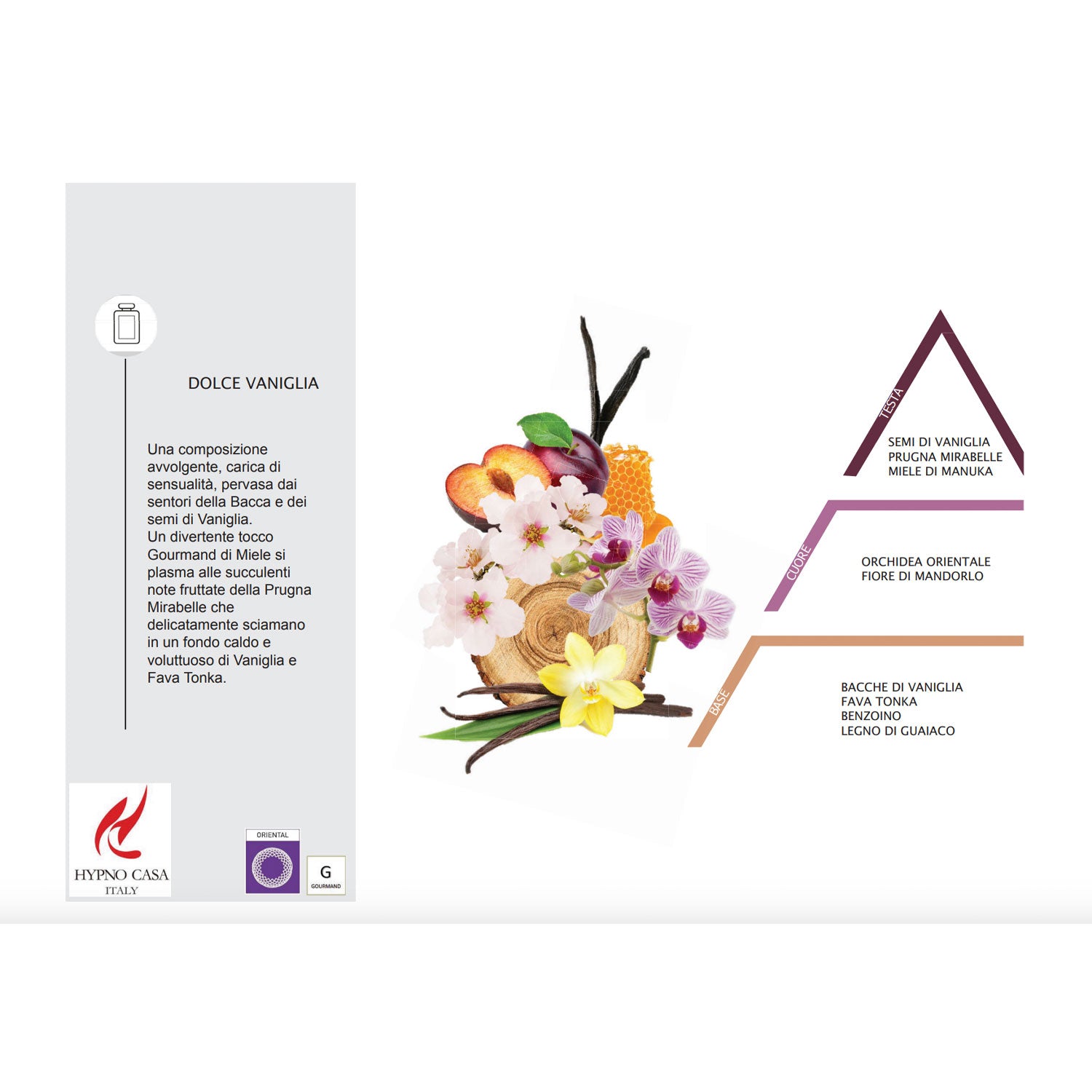 Dolce Vaniglia: una composizione avvolgente, carica di sensualità, pervasa dai sentori della Bacca e dei semi di Vaniglia. Un divertente tocco Gourmand di Miele si plasma alle succulenti note fruttate della Prugna Mirabelle che delicatamente sciamano in un fondo caldo e voluttuoso di Vaniglia e Fava Tonka.