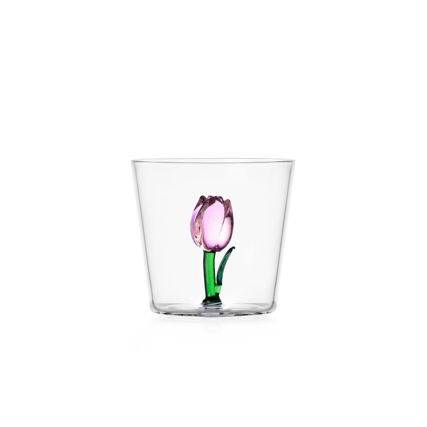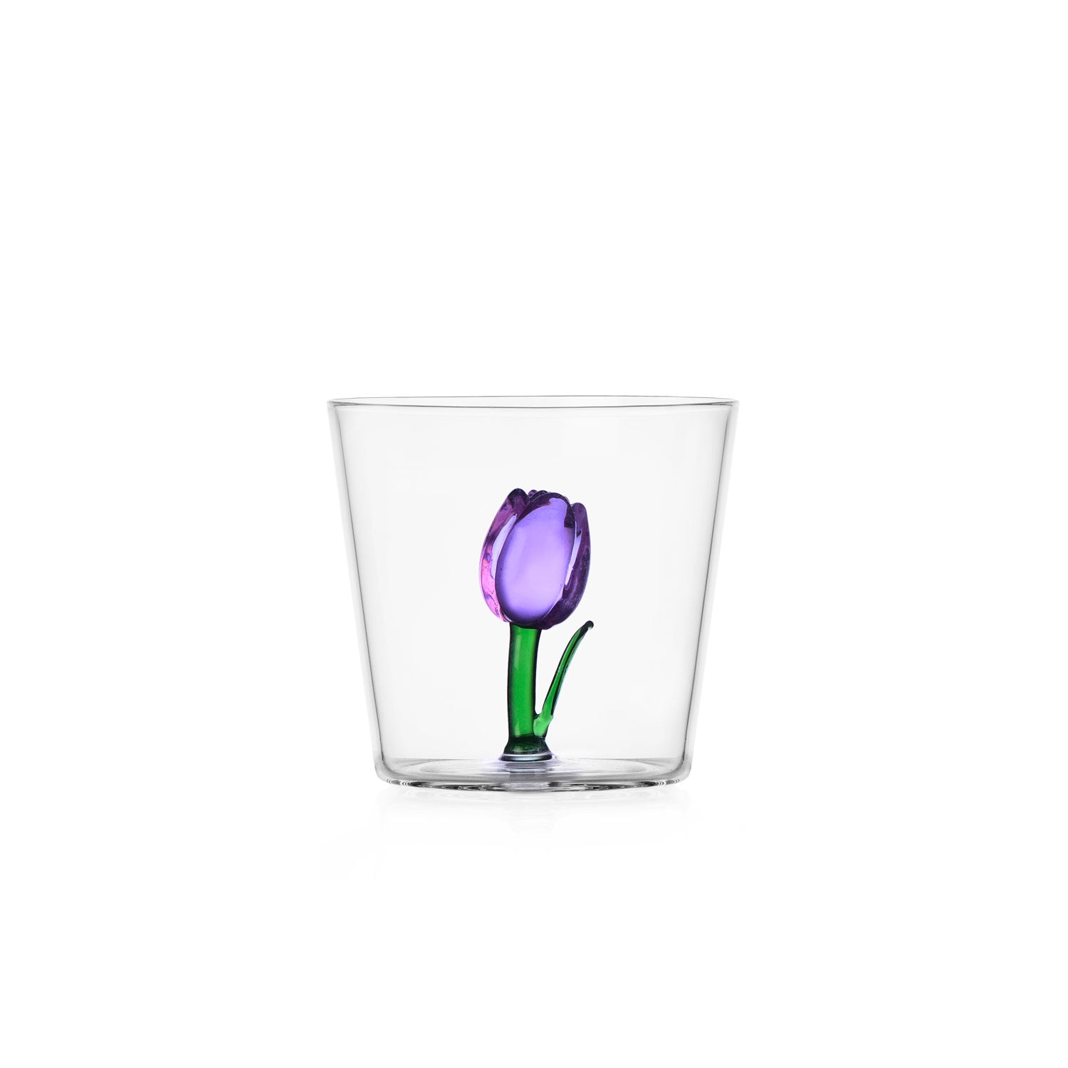 Realizzati in vetro borosilicato soffiato e lavorato a mano, ogni tumbler presenta al suo interno un tulipano tridimensionale in un colore diverso (come blu, giallo, rosa e lilla), creando un effetto visivo poetico e luminoso che celebra la bellezza della natura.