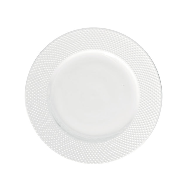 Il colore passepartout per eccellenza - il bianco - si abbina a un delicatissimo decoro a rilievo. Un motivo puntinato che orna ogni prodotto della collezione con indicibile grazia. Per una tavola in grado di richiamare bellezza ad ogni stagione. Set composto da 6 piatti.