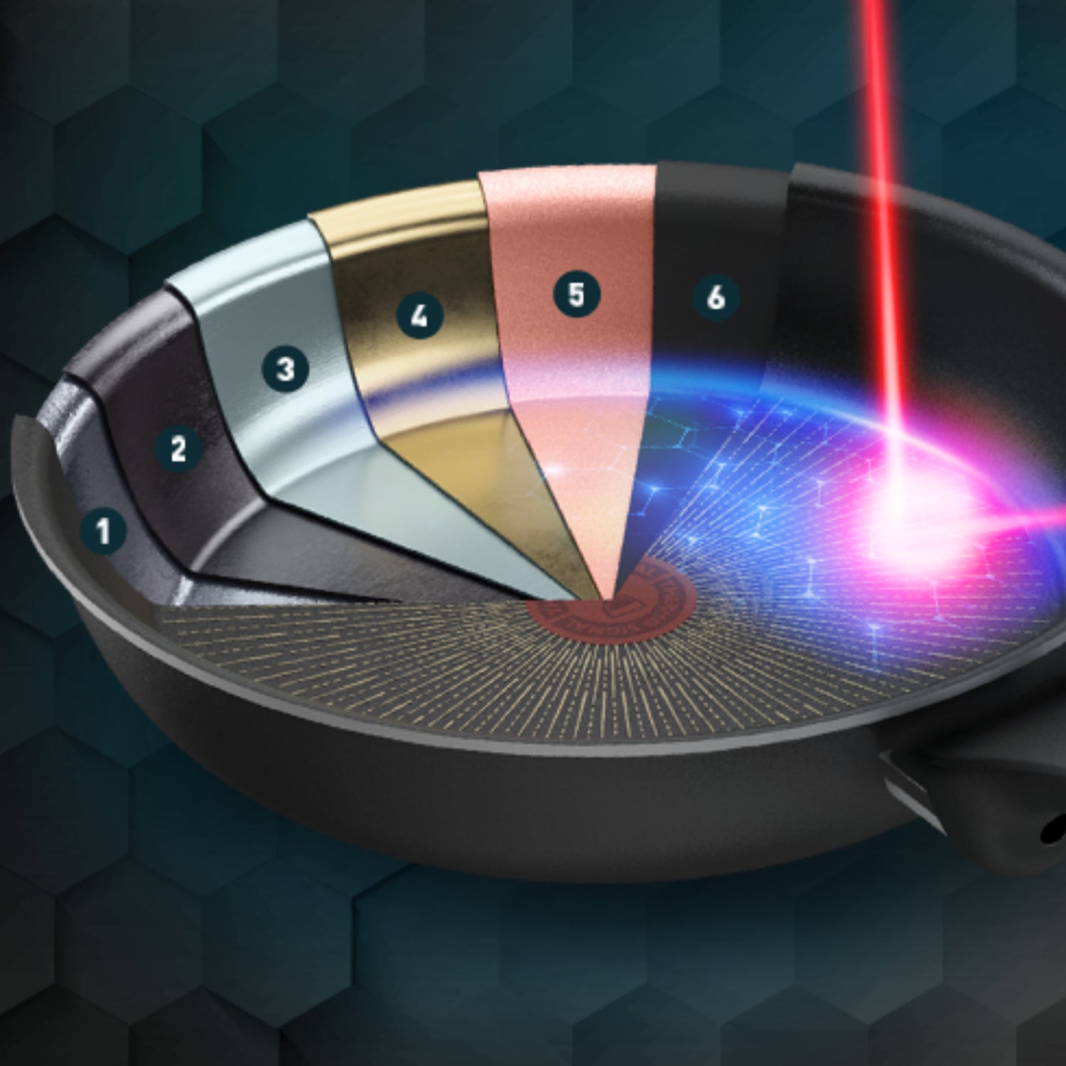 Le padelle della gamma Unlimited sono dotate di un nuovo rivestimento a 6 strati rinforzato, che resiste anche all'uso degli utensili in metallo. La tecnologia Thermo-Signal indica il momento perfetto per iniziare a cucinare, mentre il fondo a induzione assicura una distribuzione uniforme del calore per piatti deliziosi. Compatibili con tutti i piani cottura, inclusi gas e induzione, le padelle Unlimited sono dotate di un nuovo fondo di ultima generazione per una cottura rapida e uniforme.