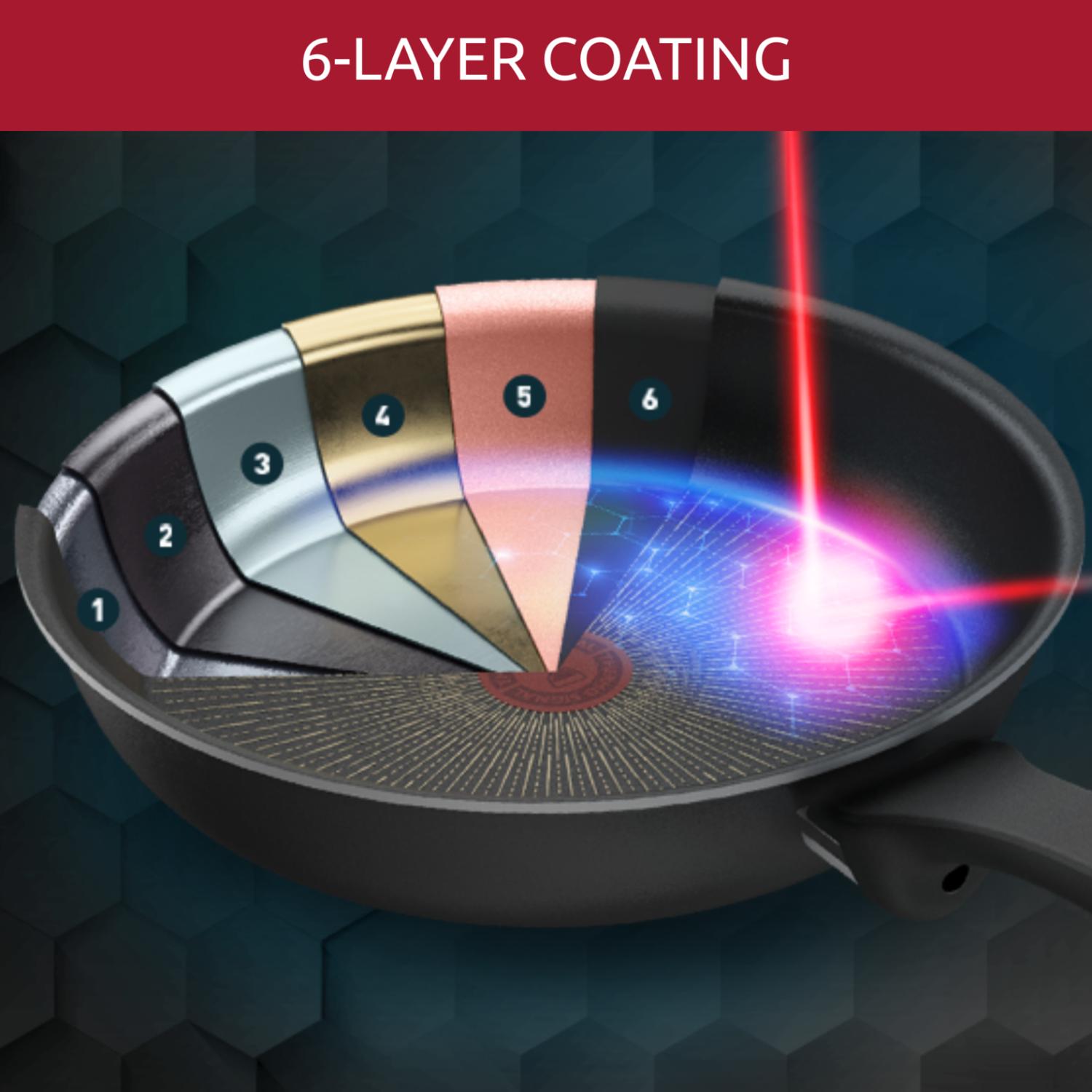 Le padelle della gamma Unlimited sono dotate di un nuovo rivestimento a 6 strati rinforzato, che resiste anche all'uso degli utensili in metallo. La tecnologia Thermo-Signal indica il momento perfetto per iniziare a cucinare, mentre il fondo a induzione assicura una distribuzione uniforme del calore per piatti deliziosi. Compatibili con tutti i piani cottura, inclusi gas e induzione, le padelle Unlimited sono dotate di un nuovo fondo di ultima generazione per una cottura rapida e uniforme.