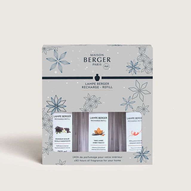 La confezione da 3 ricariche Lampe Berger da 250 ml è così formata: