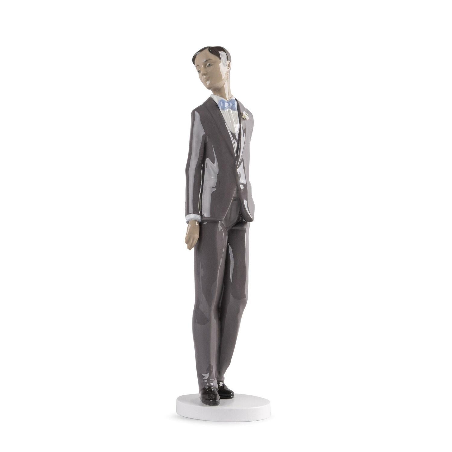 Il fidanzato, realizzato in porcellana lucida, è caratterizzato da un elegante papillon blu e un raffinato dettaglio floreale sul bavero, che aggiunge un tocco di sofisticazione. La scultura poggia su una base in legno con una finitura bianca opaca, fissata in modo permanente per garantire stabilità e durata nel tempo.