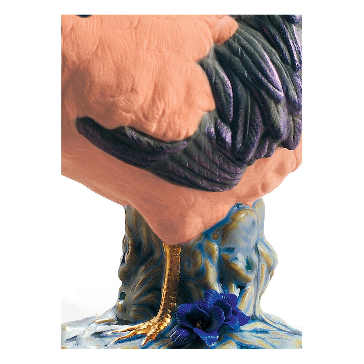 Uno degli elementi più iconici di questo pezzo è il fiore modellato petalo per petalo, un emblema distintivo di Lladró. Decorato in un blu intenso e arricchito da un tocco di lucentezza sullo stigma, il fiore aggiunge un'ulteriore dimensione di bellezza e raffinatezza all'opera. Un tributo perfetto al Gallo e alla sua personalità vivace e unica.