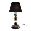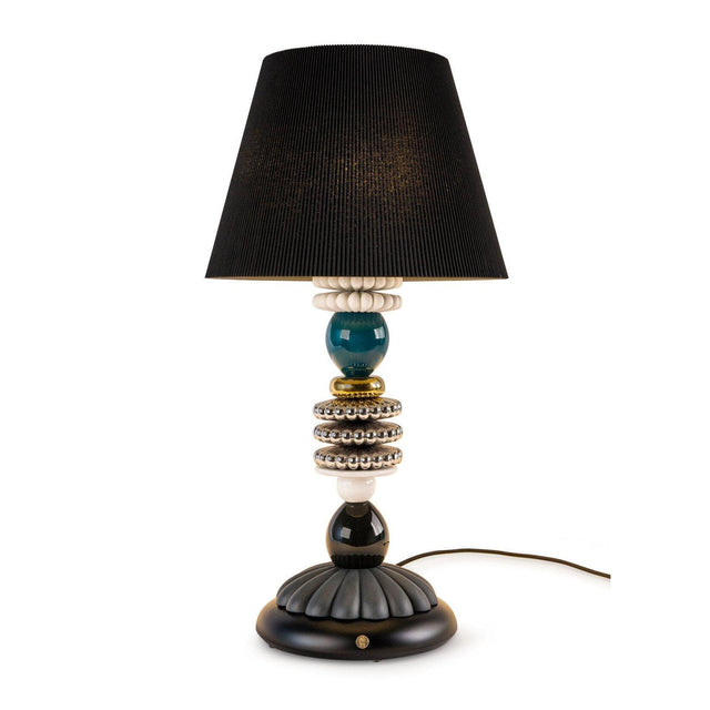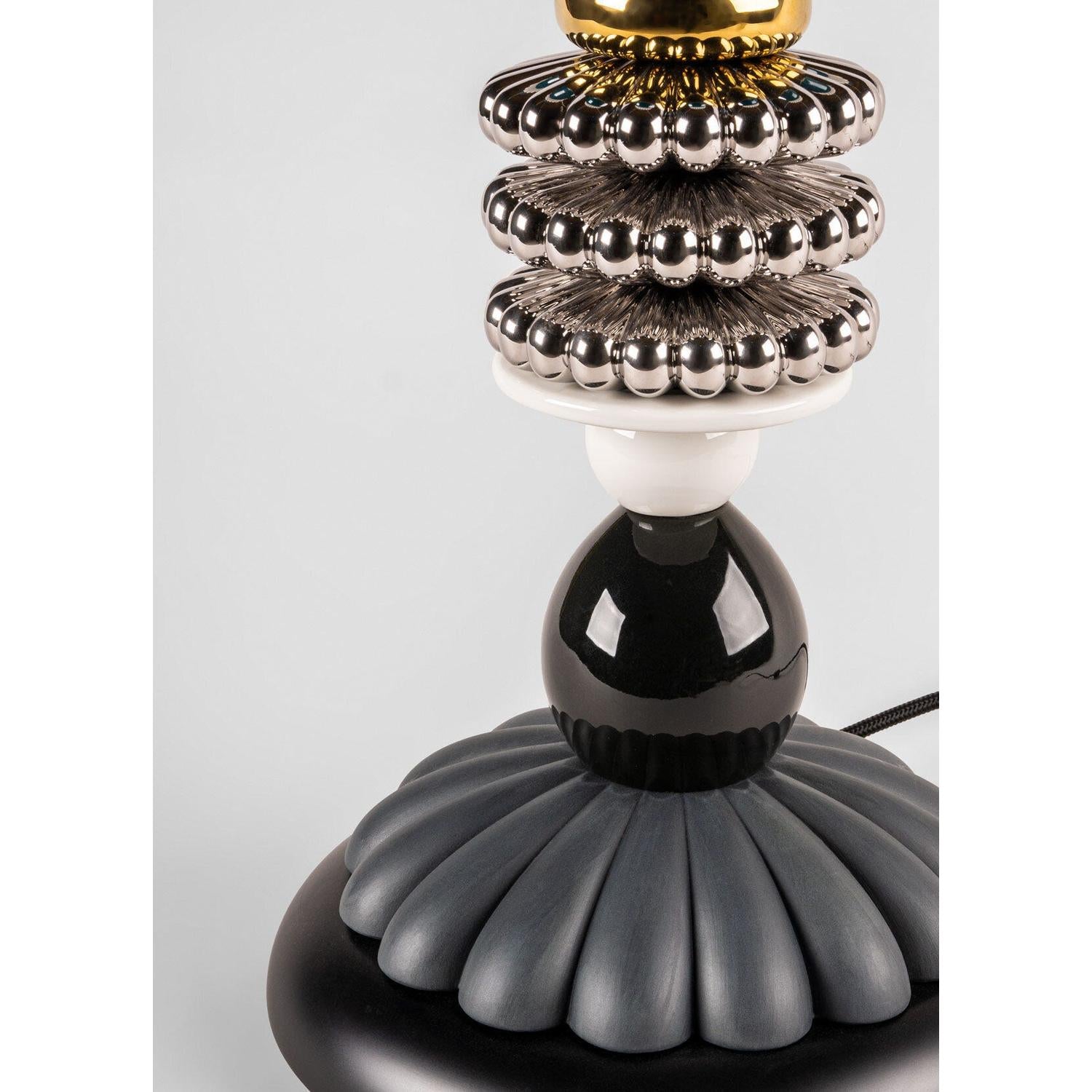 La lampada si distingue per una decorazione che unisce colori metallizzati e il nero, in netto contrasto con la purezza del bianco. Il paralume, realizzato in tessuto nero con interni dorati, crea un effetto cromatico unico, capace di diffondere una luce calda ed elegante. Una scelta che riflette l'attenzione ai dettagli e la ricerca di un'estetica raffinata.