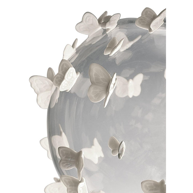 Questa lampada a sospensione, dal design drammatico e scultoreo, unisce il fascino del vetro soffiato alla delicatezza di farfalle di porcellana fatte a mano. Una volta accesa, la lampada prende vita, proiettando ombre teatrali che danzano sulle pareti circostanti. La sua luce intensa e avvolgente si trasforma in un elemento unico e straordinario, capace di arricchire e impreziosire qualsiasi spazio interno.