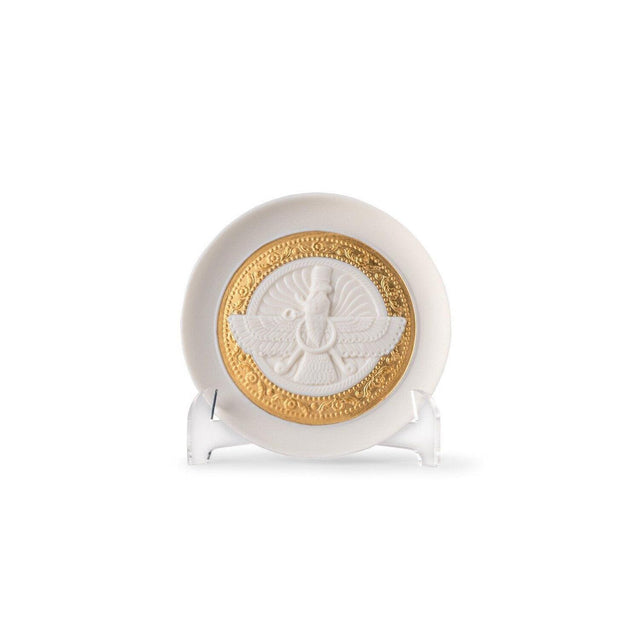 Nel bassorilievo realizzato dagli artisti di Lladró, l'aura sacra dell'Asho Farohar viene esaltata attraverso un lavoro ornamentale delicato e raffinato. L'elegante contrasto tra il lustro dorato del bordo e la purezza della porcellana bianca dona al piatto un'aura di sacralità e bellezza, rendendo omaggio a uno dei simboli più significativi della cultura Parsi.