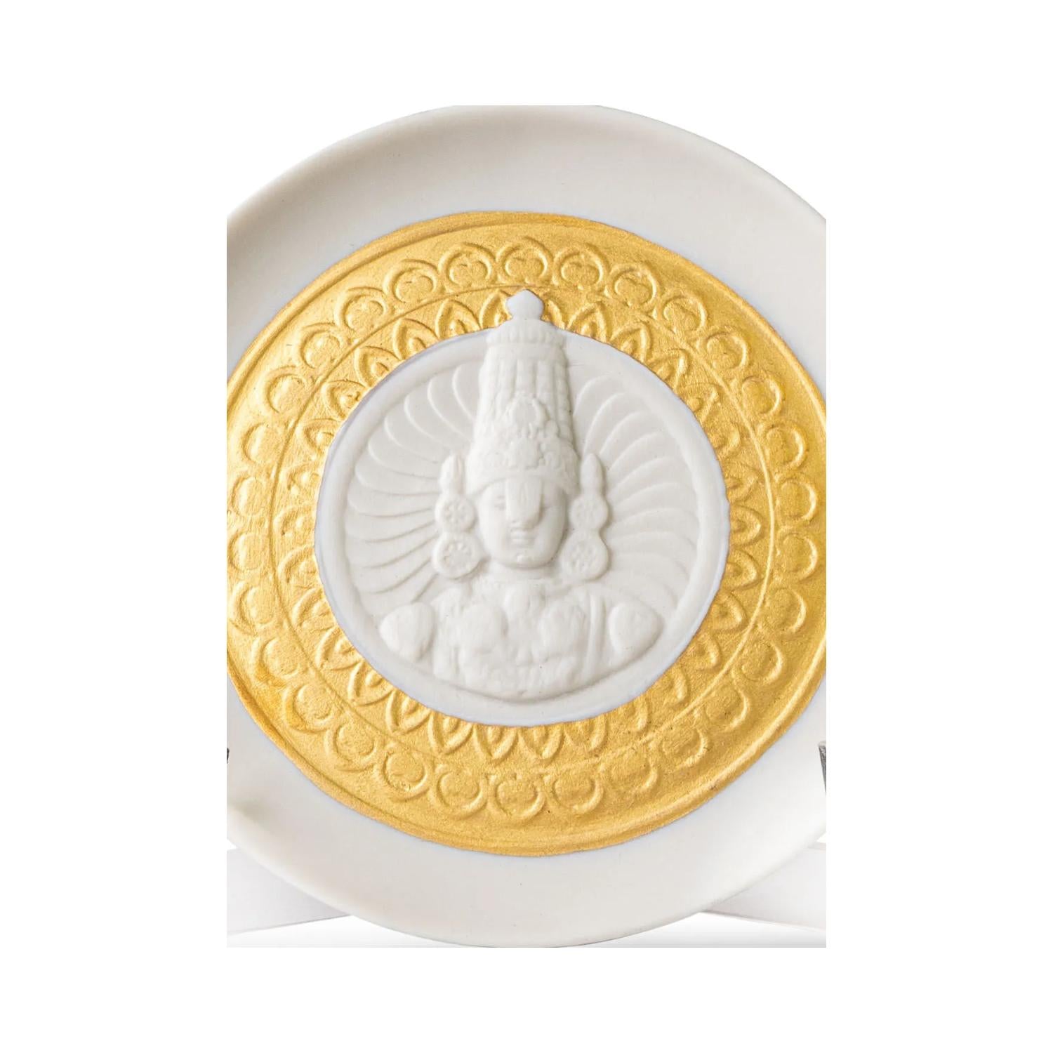 Realizzato in porcellana, questo piatto raffigura Lord Balaji, conosciuto come il Signore dei Miracoli, ed è inciso con una dovizia di dettagli che rispecchiano la millenaria tradizione della cultura indiana. Ogni tratto è curato con precisione, rendendo omaggio a una delle divinità indù più venerate.