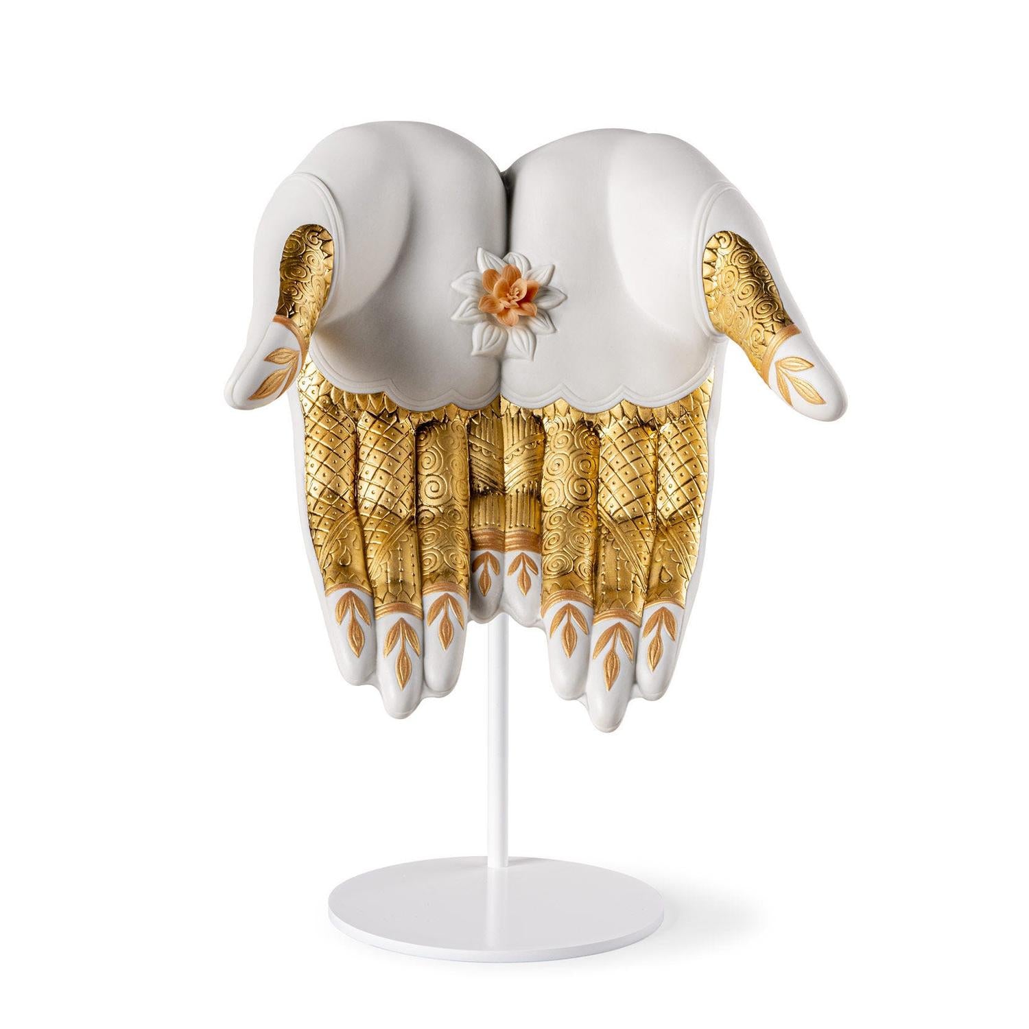 Il Mudra dell'Abbondanza si ispira a questi antichi gesti. In questa versione, la mano è decorata con motivi geometrici e vegetali, meticolosamente incisi sulle dita. Le mani poggiano su un fiore, realizzato con petali delicati e lavorati uno a uno a mano. Le incisioni sono arricchite da diverse tonalità di lustro dorato, alcune con finitura smaltata e altre opaca. Il fiore, invece, è decorato con una tonalità che unisce giallo, rosa e un tocco di dorato.